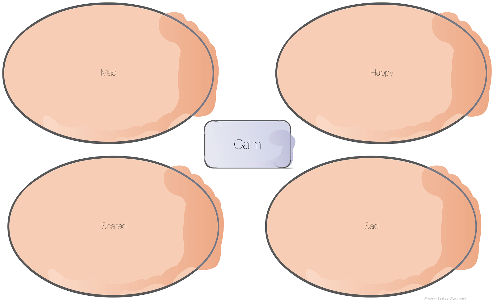 The farther from the center, the more amplified state the emotion is (e.g. the edge of Sad could be seen as depression)